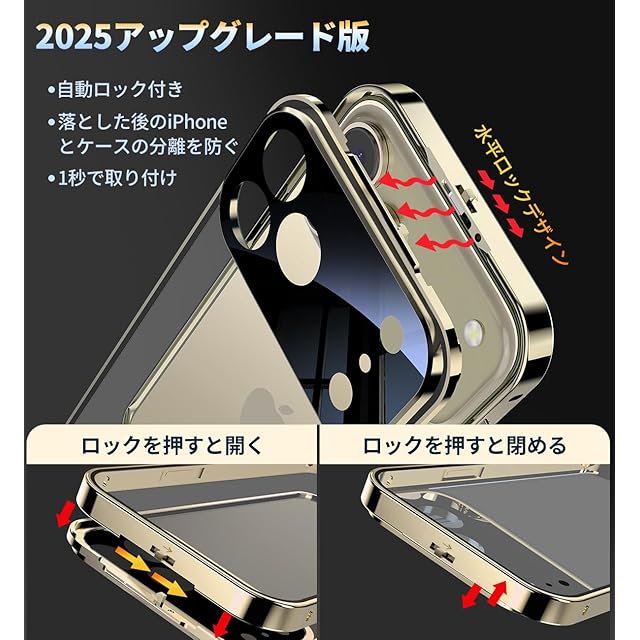 【ロック機能付き・1秒で取り付け・一体型レンズ保護付き】革新的な技術、このiPhone17 Pro Max両面ケースは上部にスライドボタン式のロックがあり、前後のケースをしっかり固定します。上部のボタンを押すだけで、ロックの解除も簡単、取り付けで開く非常に便利です。こちらのアイフォン17プロマックスケースであなたの大切なスマホを守ってあげてください!このiPhone17 Pro Max ケースのバンパーとレンズ保護フィルムが一体型になっており、背面カメラ周りを覆い、カメラへの傷を防ぐ、カメラレンズ保護設計です。レンズの保護フィルムの必要はありません。
