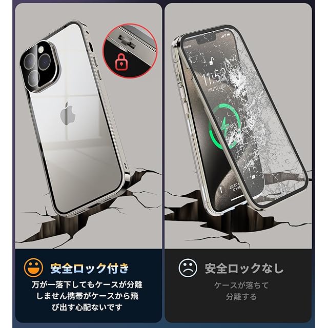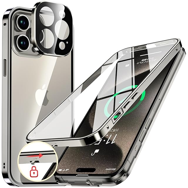 【両面9H強化ガラス・高感度タッチ】このiPhone15 Pro ケースは、9H硬度ガラス素材を採用されて、鍵やカッターなどの鋭利なもので切りつけてもキズが付きにくく、耐衝撃性と耐傷性に優れています。両面9H強化ガラス + ロック機能付きメタルフレームの組み合わせにより、落下保護が向上し、iPhone15 Proを全方位からしっかりと守れます。前カバーの画面、3Dタッチ機能により、応答性能が優れています。特殊コーティング技術でスムースな指すべりで操作性アップでゲームをしても楽しめます。★注意:画面保護フィルムを貼ってる必要はありません、操作反応が低下します。
