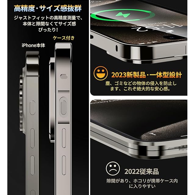 【メタルフレーム・背面クリア・信号干渉なし】このスマホケース iphone15 proは、高品質の航空アルミニウム合金製フレームを使用しており、おしゃれで高級感が溢れています。酸化の表面処理により保護カバーは擦れに強い、傷つきにくい。このiPhone15 Pro全面保護ケースの背面として高透過率に経ったガラス素材を用い、本体の色をより良く楽しめる、より一層高級感を引き出せます。本体の美しさをエンジョイする際に、ご好みの写真・ステッカーなども入れ、カスタマイズが可能です。このiPhone15 Pro ケースは信号強度が影響を受けないように設計されています。ケースはマグネットを使用しない、電波を遮らないように受信専用の穴を設けてあるため、信号は良好で、WiFiは遮られていません。