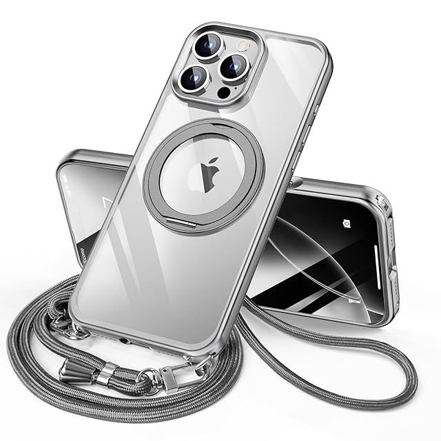 iPhone 16 Pro Max 用 ケース ダブルリング付き ショルダー ストラップ付き 多機能360度回転スタンド MagSafe対応 ワイヤレス充電対応 耐衝撃 カメラレンズ保護 三眼 6.9インチ いphone16pro max 用 ケース 薄型 透明 PC + 軽量 シリコン TPUバンパー おしゃれ スマホケース (グレー, iPhone 16 Pro Max)