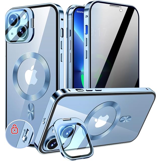 KELLCASE【カメラレンズ保護・スタンド+覗き見防止+MagSafe対応 】iPhone 13 用 ケース 全面保護 隠しスタンド付き ロック付き 両面 マグネット式 アイフォン 13 カバー ストラップホール付き透明背面 メタルフレーム 磁石 ワイヤレス充電対応 9H強化ガラス 高感度タッチ あいふぉん13 用 ケース 6.1インチ(シエラブルー)