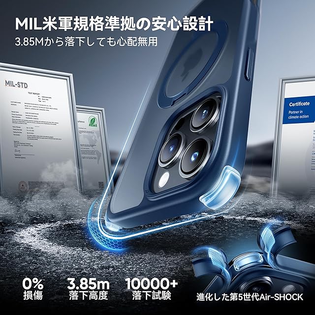 【MIL米軍規格取得・驚異の防御!】業界高レベルの硬度と耐衝撃度を実現。3.85Mから落下させてもスマホ本体は綺麗に無傷!過酷な米国国防総省の耐衝撃試験「MIL-STD-810G」認証クリアし、特別な振動低減技術と三重耐衝撃構造、ケースの四隅に進化された第5世代AIR‐SHOCHを搭載することにより、衝撃吸収性能を20倍アップ!どのような角度の衝撃に対しても受け止めて大切なスマホをしっかりと保護!また、側面にだけの滑り止め設計により、ホールド感が高まり、春から夏にかけて手汗が濡らしても滑りにくい。米軍MIL認証番号:GZMR240702237705|認証機関:CSTC Standards Testing Center | 認証時間:Jul 20, 2024