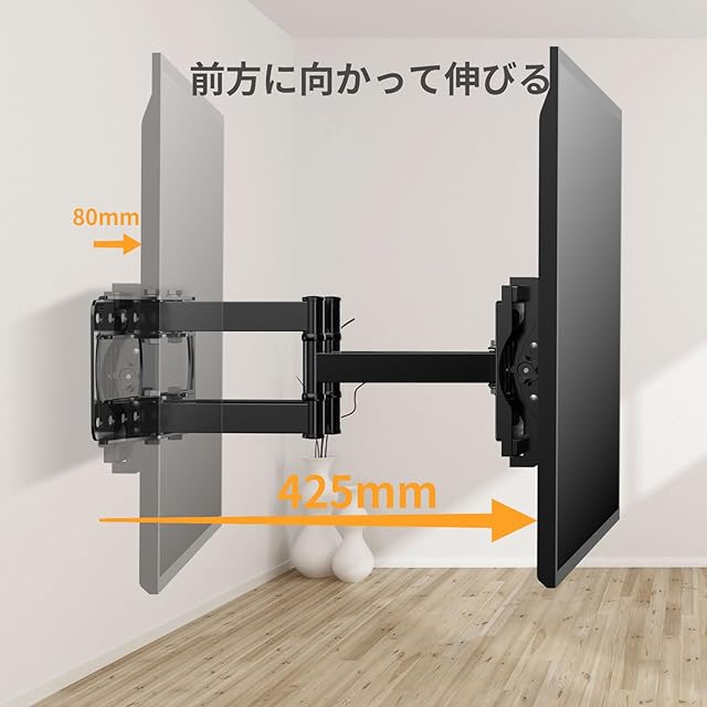 仰視・俯視角度、左右、前後、調整可能 - 回転式テレビ壁掛けブラケットはテレビを上に+15°、下に-15°傾けて、眩しさを減らすことができます。左右に45°ずつ回転調節することで、自分の見る位置に合わせてテレビの向きを変えることができます。サスペンションアームは、壁から80ミリメートルから425ミリメートルまで延びることができる。視聴場所に応じてさまざまなインストール方法を選択して、テレビを楽しむことができます!