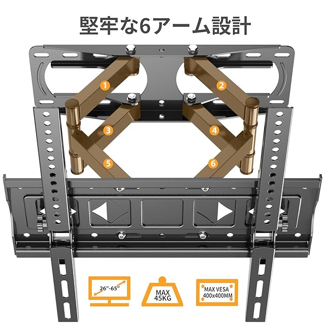 ご購入前にご確認ください - 購入前に、テレビのVESA、重量、サイズ仕様を確認してください。1、テレビのサイズは26~65インチまで 。2、テレビとテレビアクセサリーの重量は45kg以内。 3、テレビ背面のネジ穴の間隔:幅100~400mm 、高さ100~400mm。 アーム式壁掛けテレビ金具はVESA 100x100mm、200x200mm、200x100mm、300x300mm、300x200mm、400X400mm、400X300mm、400X200mm に対応しています。