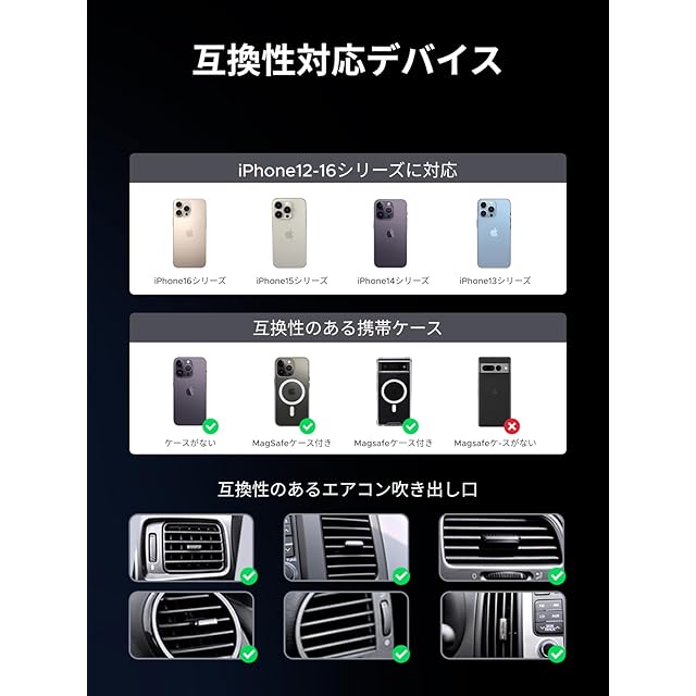 【iPhoneシリーズのために設計】:MagSafeワイヤレス車充電器はiPhone 16/16 Pro Max/iPhone 15/iPhone 15 Plus/15 Pro/15 Pro Max/14/14 Pro/14 Plus/14 Pro Max/13/13 Pro/13 Pro Max/13 Mini/12/12 Pro/12 Pro Max/12 Miniなどに対応します。より良い使い心地のために、携帯電話ケースを使用する場合は、必ずアップル社またはアップル社認定のMagSafe携帯電話ケースを使用してください。