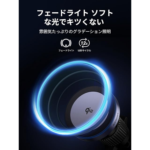 【フェードライト】: UGREEN ワイヤレス車載充電器は、グラデーションLEDライトを搭載しています。LEDライトが車の内部に美しい光を放ち、ドライブ中の雰囲気を一層華やかに演出します。高品質な材料で作られており、車内のインテリアにもマッチします。この車載用スマホホルダーは、快適なドライブをさらに楽しめるアイテムです。