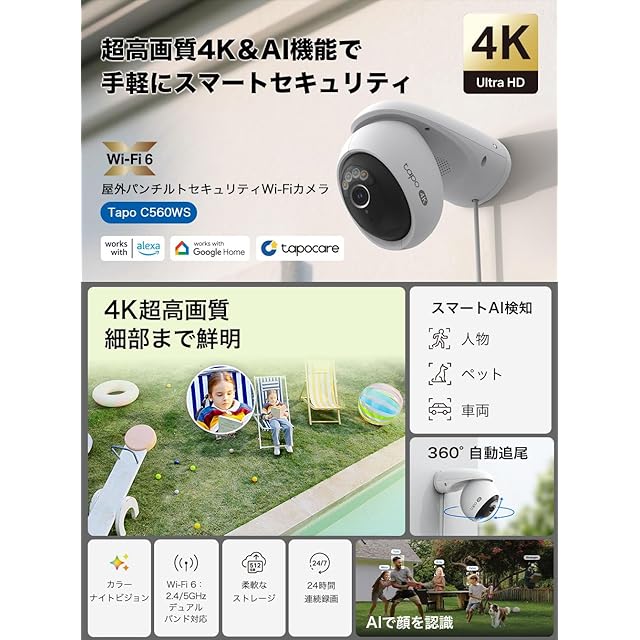 商品名:TP-Link Tapo 防犯カメラ 屋外 監視カメラ みまもりカメラ 見守りカメラ スマホ対応 Wi-Fi 4K 8MP 800万画素 パン/チルト 360°AI検知 フルカラー IP66 防水防塵 音声通話 Tapo C560WS