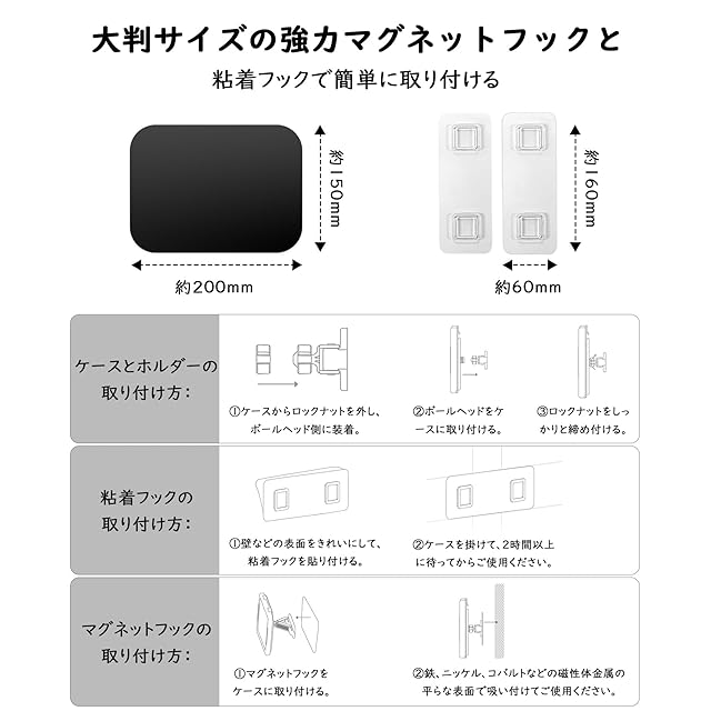 <p><strong>取り付け手順:</strong><br>①ケースからロックナットを外して、ボールヘッド側に装着します。<br>②ボールヘッドをケースに取り付けます。<br>③ロックナットをしっかりと締め付けます。<br><br></p><p><strong>粘着フックの取り付け方:</strong><br>①壁などの表面をきれいにして、粘着フックを貼り付けます。<br>②ケースを掛けて、2時間以上に待ってからご使用ください。<br><br></p><p><strong>マグネットフックの取り付け方:</strong><br>①マグネットフックをケースに取り付けます。<br>②鉄、ニッケル、コバルトなどの磁性体金属の平らな表面で吸い付けます。<br><br></p><p><strong>安全にお使いいただくための注意事項</strong><br>本製品は完全防水仕様ではありません。長時間の水没やプール・海などでの使用は避けてください。<br>シャワー使用時は直接水をかけ続けないでください。<br>使用後は水分をよく拭き取って保管してください。<br><br></p><p><strong>取り扱いに関する注意事項</strong><br>製品本体を強く押したり、無理な角度で使用しないでください。<br>マグネット部分にクレジットカード等を近づけないでください。<br>付属の粘着フックは一度剥がすと再使用できません。<br><br></p><p><strong><免責事項></strong><br>本製品の不適切な使用によるいかなる損害・故障についても当社は責任を負いかねます。<br>防水性能は使用環境や経年変化により低下する場合があります。<br>対応機種外のデバイス使用による不具合は対象外となります。<br>改造・分解した場合のは無効となります。<br>自然災害や通常想定しない使用環境での故障は対象外です。</p>