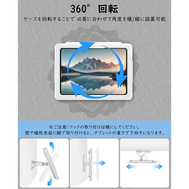 「角度調整と伸縮アームで最適な視野を確保」360°回転可能なボールジョイントと伸縮式アームを搭載し、縦・横・斜めなどあらゆる角度でタブレットを固定可能です。角度調整機能により、料理中のレシピ確認は縦位置、お風呂での動画視聴は横位置など、シーンに合わせて自由に設定できます。45°の開口角度制限で誤操作を防止しつつ、デバイスの出し入れも容易にしています。ロックスイッチ採用したため、使用中にカバーが開く心配がありません。 ※ご注意:伸縮アームは角度調整用であり、縦でのご使用には、タブレットの重量によっては自然と下向きになる場合があります。磁石で壁掛けする場合は、磁石の位置を取り付け直すことで簡単に高さを変更可能ですが、粘着フック使用時は設置位置の変更が難しいため、最初の取り付け位置を慎重に決めることをおすすめします。