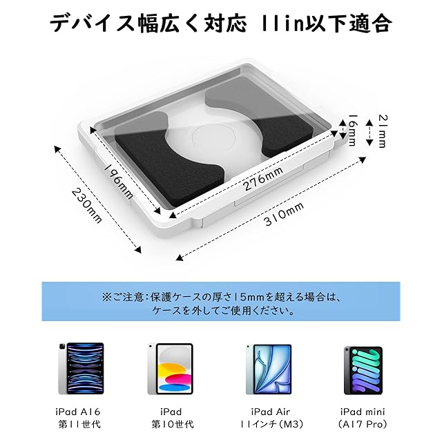 「11インチ以下のタブレットに幅広対応」ケース内寸:276×196×16mm。iPad第11世代/iPad10/9/8/7/6世代、iPad Mini全モデル、iPad Pro 11インチ/Air 11インチ、各種Androidタブレットなど、11インチ以下で厚さ15mm以内のタブレットや大型スマホに対応します。※保護ケース装着時で厚さ15mmを超える場合は、ケースを外してご使用ください。