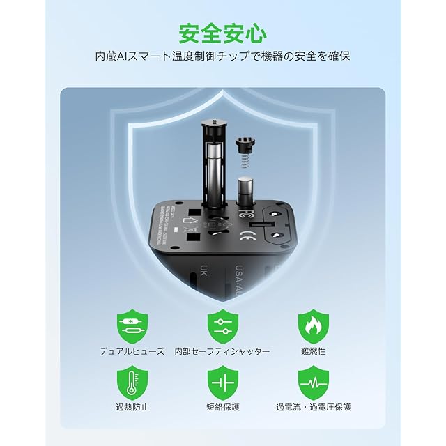 【安全な設計で安心にお使いいただけます】MOMAXのマルチ変換プラグはROHS、CEおよびFCC認証済みです。GaN冷却と耐火PC素材に加えて、マルチ保護機能搭載(過熱、過電流、過充電、短絡防止、過電力保護、過電圧保護、過放電保護)また10Aヒューズが内蔵されてありますので、使用中の安全性を保障します。