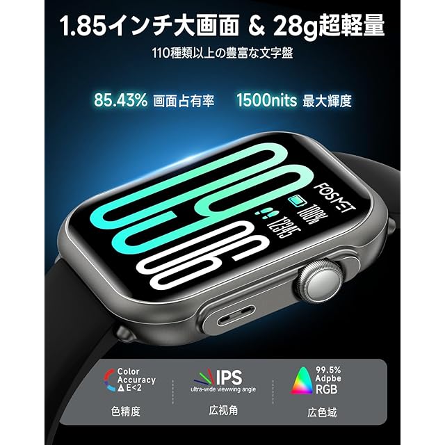 商品名:FOSMET P1 スマートウォッチ【2025新モデル·バッテリー最強】100日間スタンバイ 30日間連続使用 Bluetooth通話機能 1.85インチHD大画面 IP68防水 1500nit高輝度 明るさ調整 メッセージ通知 睡眠管理 120種類の運動モード 音楽再生 軽量28g 多種類文字盤 天気予報 スマートウォッチ iPhoneとアンドロイド対応 TELEC認証 ブラック