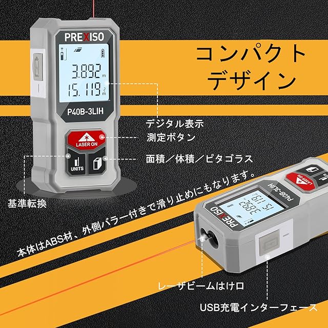 商品名:【第二代 新登場】PREXISO レーザー距離計 電子距離計 距離測定計 ミニ 40M PSC認定取得 コンパクト 高精度 USB充電式 6種測定モード 距離 面積 体積 ピタゴラス測定 連続測定 自動計算 操作簡単 日曜大工 家庭 建設現場 土木現場の室内測定 グレー