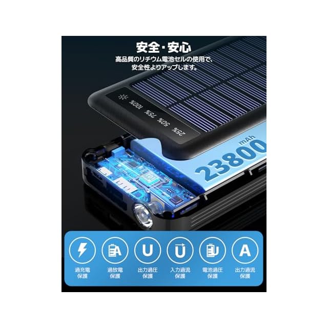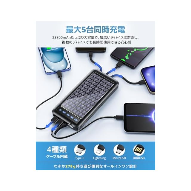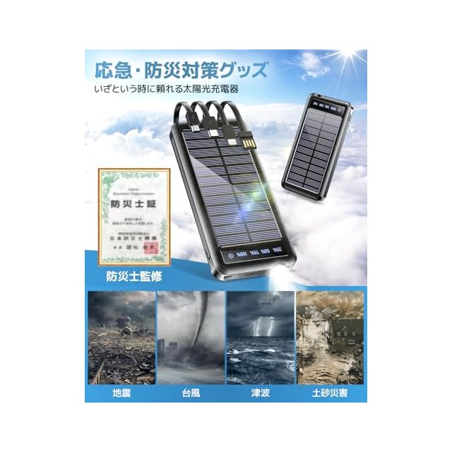 2025年最新モデルのソーラーモバイルバッテリーは、高効率単結晶シリコンソーラーパネル搭載で曇りや薄暗い日光でも充電可能。Lightning、Type-C、MicroUSB、USB-Aの4種類の内蔵ケーブルをスマートに収納でき、ネックファンやスマホなど多様な機器を外出先や災害時に即座に充電可能です。23800mAhの大容量で最大5台同時充電に対応し、急速充電2.Aや温度制御機能で安全・効率的に電力供給。太陽光・USB・Type-Cの3WAY充電に加え、IP67防水防塵・耐衝撃仕様でアウトドアや非常時でも安心。LCD残量表示や内蔵LEDライト、軽量コンパクト設計で持ち運びも便利です。過充電・過放電・過電流・短絡防止の多重安全保護機能やPSE認証、充実のアフターサービスにより、災害対策・アウトドア・日常生活で信頼できる1台です。