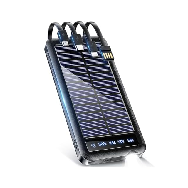 【2025新登場・4つの内蔵充電ケーブル搭載】災害対策やアウトドアシーンに最適な2025年最新モデルの ソーラー モバイルバッテリー が登場。高効率単結晶シリコンソーラーパネルを搭載し、曇りや薄暗い日光でもしっかり充電可能。Lightning、Type-C、MicroUSB、USB-Aの4種類の内蔵ケーブルを本体にスマート収納できるため、別途ケーブルを持ち歩く必要はありません。ネックファンや首掛け扇風機、スマホ、ワイヤレスイヤホンなど、多様な機器を外出先や災害時でも即座に充電可能。さらにUSB-AとType-C出力ポートを併用すれば、友人や家族とシェアして同時に充電でき、アウトドアや緊急時でも活躍する1台です。