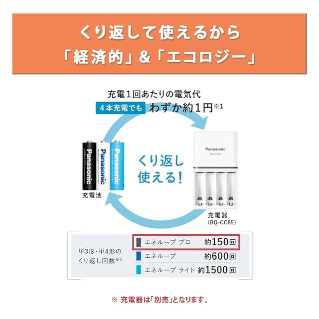 ・高容量で、長時間機器を使いたい方に最適。容量:min.2500mAh★1<br><br> ・自然放電が少ないので、充電しておけば1年後約85%★2の容量維持<br><br> ・低温特性にすぐれ、マイナス20度の寒い場所でも性能発揮。使用温度範囲:-20℃~50℃<br><br> ★1<br> JIS C8708 2019(7.3.2)の充放電条件に基づく電池の最小(min.)容量<br><br> ★2<br> 満充電して、室温(20℃)での保存後。保存条件や機器により使用時間は短くなる場合があります。その際には充電してからご使用ください。