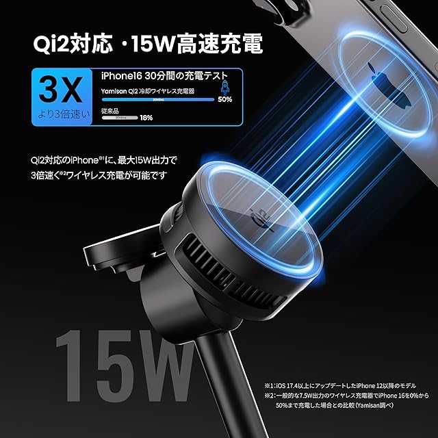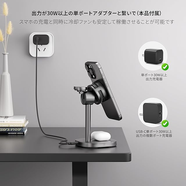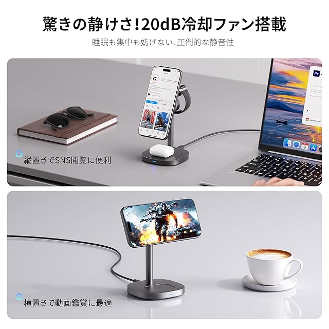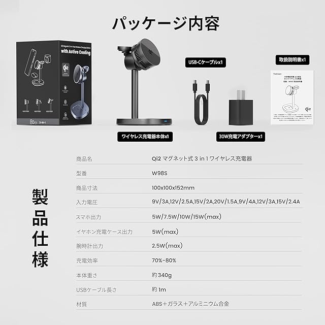 商品名:Yamisan Qi2認証 冷却ファン搭載 magsafe充電器 マグネット式 3-in-1 ワイヤレス充電器 15W急速充電 スマホ 冷却 マグセーフ充電器 ワイヤレス充電ステーション/ワイヤレス出力 iPhone17-12/Apple Watch/AirPodsなどに対応 オフィス/ライブ配信/動画視聴に最適