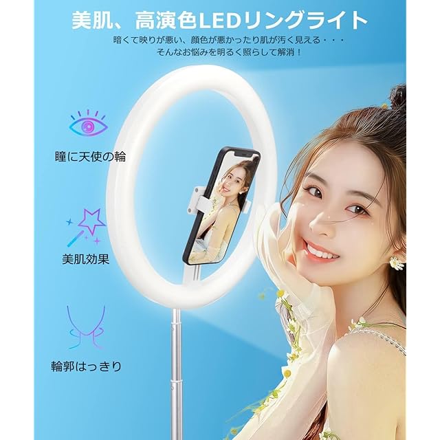 ✨【高輝度LEDリングライト・美肌効果・安定感抜群】外径11.4インチのリングライトは高輝度LEDビーズを120個搭載しているので、とても明るく、均一の安定した光出力があります!リングの内側にスマホを置いて使用することから、被写体全体に光が当たるため影ができにくく、表情が自然と明るくなります。オンライン会議やweb会議やテレワーク会議などのビジネスシーンで、好印象を与える効果もあります。そして、リングライトの底部は円盤のデザインで安定感も抜群です。底部にも滑り止めゴムが付き、擦り傷、転倒等のご心配はありません、市販の三脚スタンドリングライトより安定性と耐久性に優れています。