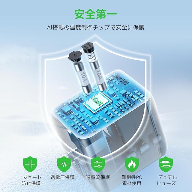 【安全な設計で安心にお使いいただけます】MOMAXのマルチ変換プラグはROHS、CEおよびFCC認証済みです。GaN冷却と耐火PC素材に加えて、マルチ保護機能搭載(過熱、過電流、過充電、短絡防止、過電力保護、過電圧保護、過放電保護)また10Aヒューズが内蔵されてありますので、使用中の安全性を保障します。