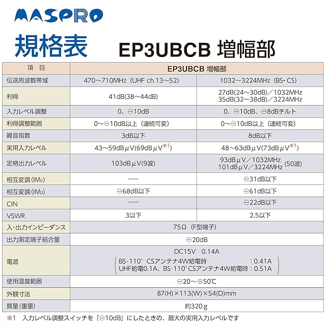 商品名:マスプロ電工 UHF・BS・CSブースター EP3UBCB
