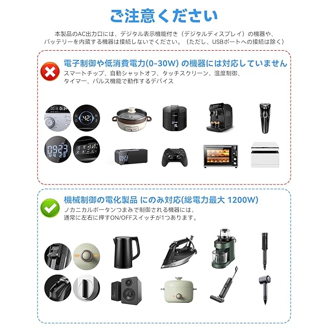 【ご使用上の注意】デジタル表示機能や内蔵バッテリーを搭載した機器は、AC出力コンセントに直接接続しないでください(これらの機器はUSBポートで充電可能です)。ACコンセントは、デジタル表示やマイコン制御のない一般的な機械式機器(カーリングアイロン、やかん、コーヒーメーカー、ドライヤー、アイロン、電気毛布、照明器具など)に適しています。ノートパソコンの充電器や携帯電話の充電器(アダプター付き)も使用可能ですが、使用時に微弱な ハム音やノイズが発生することがあります。これは正常な現象であり、機能や安全性に影響はありません