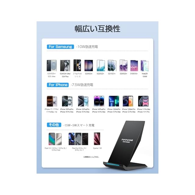 <b>USB-C改善版 NANAMI スタンド型 ワイヤレス充電器セット(QC3.0急速充電アダプター付属)</b><br> <b>基本仕様</b><br> 出力:5W/7.5W/10W/15W<br> 入力:DV5V-2A/9V-2A/12V-1.5A(Max)<br> 製品重量:約240g<br> <b>対応端末</b><br> Apple端末:iPhone 17/17 Pro/17 ProMax/Air/16e/16/16 Pro/15/15 Pro/15 ProMax/15 Plus/14/14 Pro(Max)/14 Plus/13/13 Pro/13 ProMax/13 Mini/12/12Pro/12 Mini/11/11 Pro/11 Pro Max/Xs/Xs Max/XR/X/8 Plus/8<br> Galaxy端末:S25(Ultra)/S24(Ultra)/S23(Ultra)/S22(Ultra)/S21/S20/S10/S10+ S9/S9 Plus Note9 Note8 S8/S8 Plusなど<br> その他Android端末:XperiaのQi充電機能搭載のワイヤレス充電対応する機器<br> <b>高い製品</b><br> nanamihomeは弊社製品に絶対の自信を持っています。そのため、18ヶ月と品質の高いカスタマーサポートを全ての製品に提供しています。