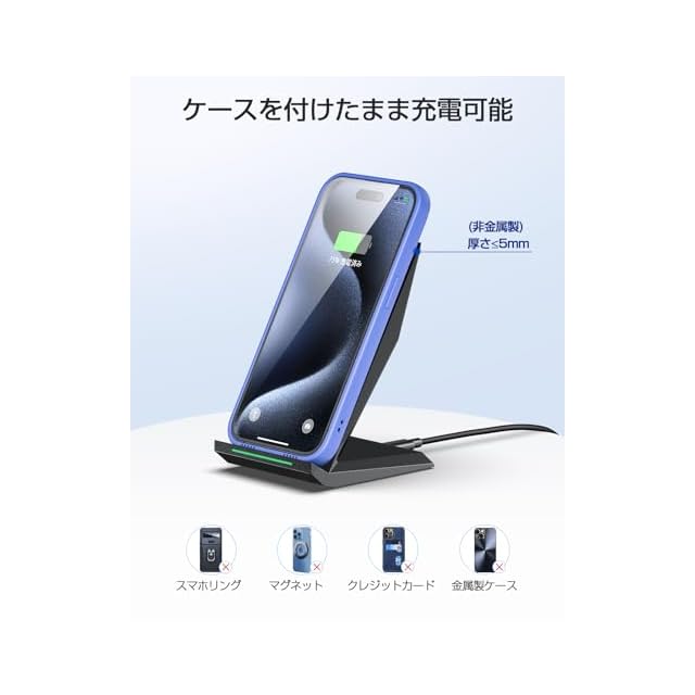 ケースつけのままでも:スマホに厚さ5mm(iPhone17/16/15/14/13/12シリーズが3mm)以下の非金属製のスマホケースを付けても、このまま置くだけで充電可能です。(お薦め:本製品はFOD異物検査機能を搭載しています。スマホケース以外の金属製、磁気を帯びる飾りや、クレジットカードを付けた場合、充電前に取り外して下さいますようお願い致します)
