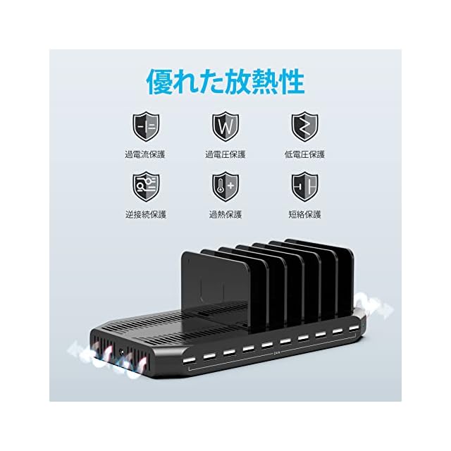【10台同時充電タイプ】付属の仕切り板(高い板11枚)で最大10台のモバイル機器をキレイに置けます。スマートIC内蔵で充電中、USBデバイス端末に適した最適な電圧を自動的に調整できます。iPadなら最大で5台まで充電できます。