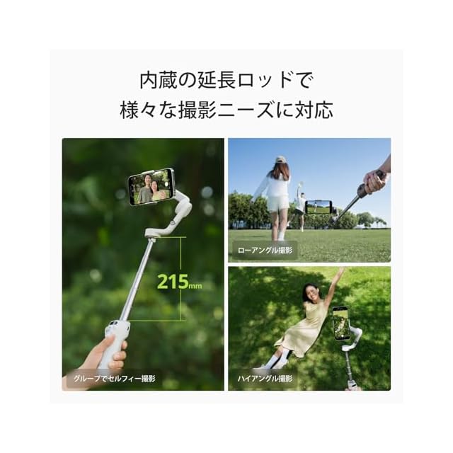 ✅[軽量、コンパクト、延長ロッド内蔵 ]- 軽量(スレートグレー/プラチナグレー:305g)で折りたたみ式のこのスマホ用ジンバルは、どこにでも気軽に持ち出せます。内蔵延長ロッドを伸ばして使えば、ユニークなアングルでの撮影やセルフィー撮影に理想的です。