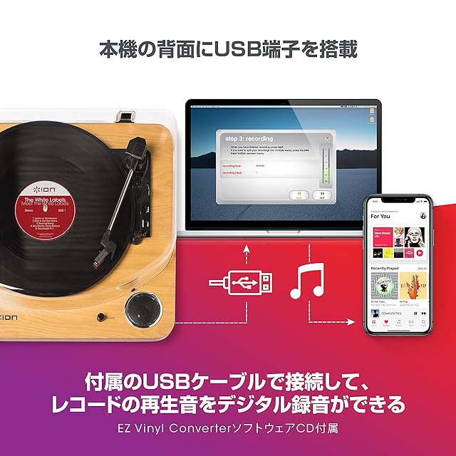 本機の背面にUSB端子を搭載、付属のUSBケーブルで接続して、レコードの再生音をデジタル録音ができる。さらにAUX入力を通してスマートフォンやCD、カセットなどの外部音源からの音声も録音可能