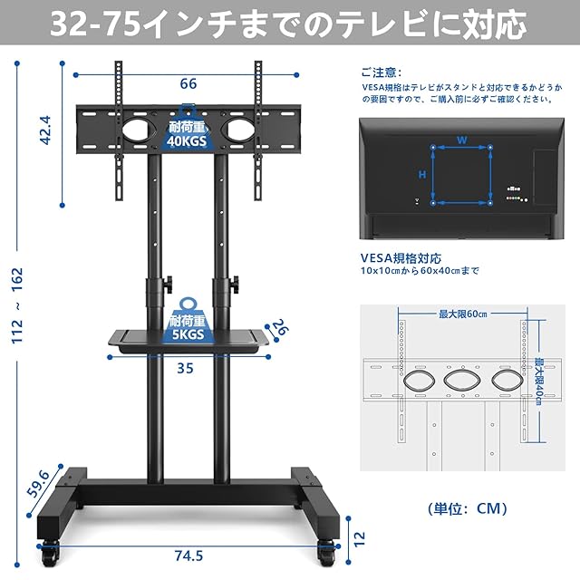 ★VESA規格対応★ VESA(テレビ背面のネジ穴間の距離)は100x100mmから600x400mmまで対応可能です。テレビスタンドが32~70インチまでのテレビやモニターに対応しています。