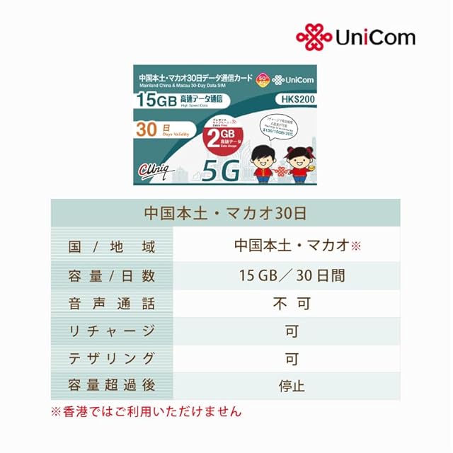 <B>【特徴】</B><br> ・正規日本語パッケージ<br> ・中国政府のネット規制対象外<br> ・Google Map、Facebook、Twitter、Instagram LINE に接続可能<br> ・開通手続き不要<br> ・データ容量15GB(<B>※データ使用量が15GBに達すると利用停止となります</B>)<br> <br> <br> <B>正規日本語版です。パッケージ等が日本語表記です。SIMの仕様やサービス内容は中国語版と同じです。</B><br> 中国本土、マカオで使用できるデータ専用プリペイドSIMです。<br> テザリングに対応しているのでSIMフリーのモバイルルータも使用できます。<br> Google Map、Facebook、Twitter、Instagram に接続可能です。<br> 面倒な開通手続き(アクチベーション)はありません。電波受信後から30日間利用できます。<br> (※データ使用量が15GBに達すると利用停止)<br> <br> <br> <B>SIMサイズ</B><br> 標準・マイクロ・ナノの3サイズに対応<br> <br> <br> <B>開通方法</B><br> 端末にSIMをセットしAPNを「3gnet」にします。<br> データ通信とデータローミング、テザリングをオンにします。<br> 電波を受信するとSMSで有効期限と管理用電話番号が通知されます。<br> モバイルルータの設定も同じです。モバイルルータの場合は標準でローミングがオフになっている<br> 場合があるのでモバイルルータのマニュアルを参照して、ローミングをオンにしてください。<br> <br> <br> <B>データ容量</B><br> 12GB(リチャージ可能)<br><br> <br> <br> <B>有効期限</B><br> 開通日を含む30日間有効です。30日目の23時59分に使用できなくなります。<br> <br> <br> <B>データ容量の確認方法</B><br> SIM台紙のQRコードよりアクセスしてください。<br> SIM記載の19桁数値とPUKパスワードが必要です。※SIMカードの台紙は処分しないようご注意ください。<br> ※携帯端末、スマートフォン専用サイトです。PCブラウザからはアクセスできません<br> ※China Unicomのアカウント登録が必要です。使用端末での容量確認をお勧めします。<br> <br> <br> <B>データ追加と有効期限の延長方法(リチャージ)</B><br> リチャージ用QRコードよりアクセスしてください。<br>