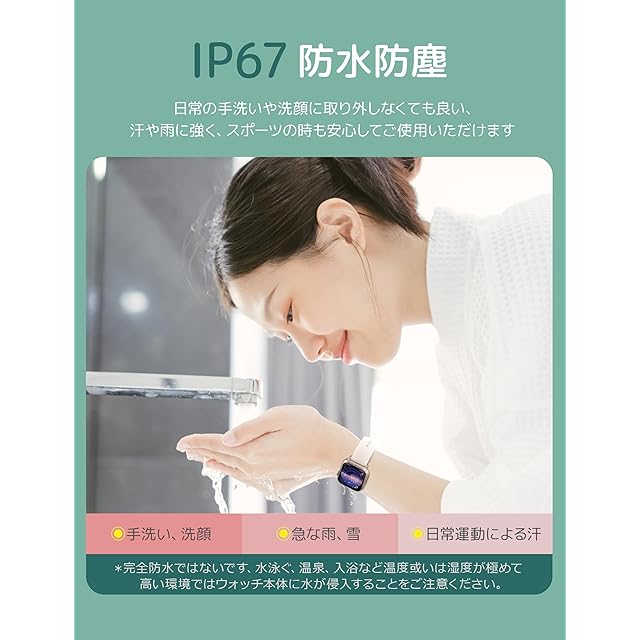 <br><b>豊かな日常生活サポート!</b><br> <br>1) 女性をサポート:月経周期、排卵日の記録と通知で、女性の生活をサポートするレディーススマートウォッチです。毎日頑張っている使用者様を応援しています。<br> <br>2) 睡眠質の記録:毎日の睡眠状態を記録しデータの形で反映されます。深い、軽い睡眠、REM、目覚めのデータを分間まで記録し、HR、ストレス、呼吸器の質を詳しく分析し、睡眠の質を採点します。<br> <br>3) 腕上げ点灯:腕を上げると画面が点灯します、無駄な電力は消耗しません(腕上げ点灯はオフにできます)。<br> <br>4)アラーム:アラームも設定でき、びっくりさせないほどの振動で目覚めさせる、寝坊する予防対策。<br> <br>5) 天気予報:スマートウォッチで簡単に天気情報を確認できます 雨、雪を事前予防できます。<br> <br>6) 騒音測定:身の回りの騒音をデシベル化し、騒音暴露レベル、時間を記録できます!<br> <br>7) 音楽制御:音楽アプリを呼び出しできて、スマホを出さなくても音楽を(再生、ストップ、次の曲、前の曲)コントロールできます。<br> <br>8) スマホ探し:スマホは身の回りにあるのに見つからない記憶はありますか?そういう場合に「スマホ探し」機能が助かります。スマホ探しアイコンをタップすればスマホを鳴らします。<br>