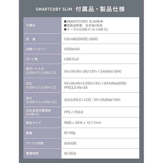 商品名:CIO モバイルバッテリー 薄型 軽量 小型 タイプC PD 20W [薄さ12mm 108g] 5000mAh 2ポート iPhone 17 / 16 / 15 / Android/iPad用 USB-C タイプC 急速充電 パススルー SMARTCOBY SLIM 20W (ホワイト)