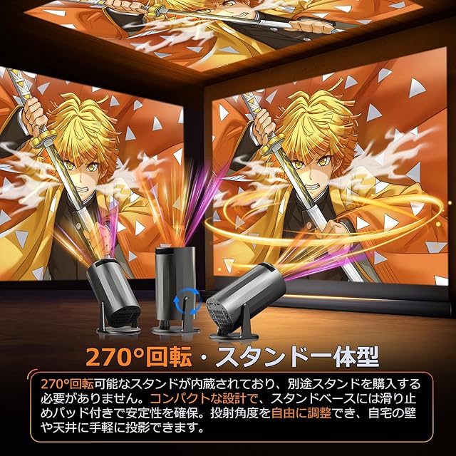 【270°回転・自動台形補正・操作簡単】この小型プロジェクターは270°回転可能な一体型スタンドを採用し、底面には滑り止めパッドを装備しているため、あらゆる角度に調整しても転倒の心配がありません。スタンドを軽く回すだけで投射方向を自由に選択でき、壁や天井などあらゆる表面に正確に投影できます。自動台形補正機能を内蔵し、面倒な手動調整なしで瞬時に画面を補正します。プロジェクター本体をどのように上下に傾けても、一瞬で自動台形補正を実行します。