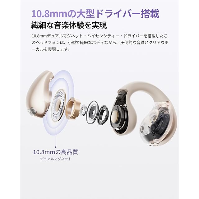 【繊細な音楽体験を実現】このイヤーカフイヤホンは、10.8mmデュアルマグネット・ハイセンシティー・ドライバーを搭載しており、圧倒的な音質とクリアなボーカルを実現しています。小型で繊細なボディでありながら、立体感のある空間オーディオを提供するこのBluetoothイヤホンは、快適な着け心地とスタイリッシュなデザインを兼ね備えています。まるでサウンドに包まれているかのような、よりリアルなリスニング体験を楽しめます。