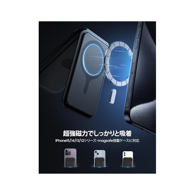 【強力磁力でしっかりと吸着】約1200gまでの荷重に耐える強力磁力です。iPhone 17/16/15/ 14 / 13 / 12 シリーズをしっかりと吸着できます。マグネット式で、iPhone MagSafe シリーズ本体やMagSafe搭載ケースに簡単に装着できます。マグネットなので跡を残さず取り外し可能です。テープ跡や糊残りを気にせずお使いのスマホをきれいな状態でご利用できます。