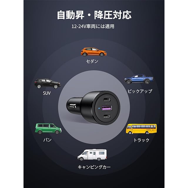【3ポートで急速充電・複数の急速充電プロトコルをサポート】本製品シガーソケットはUSB C×2+USB Aのポート構成で3つのモバイルデバイスを同時にフルスピードで充電!3ポート同時に使用する場合、出力配分によりパワーが落ちる恐れがあることをご注意ください。