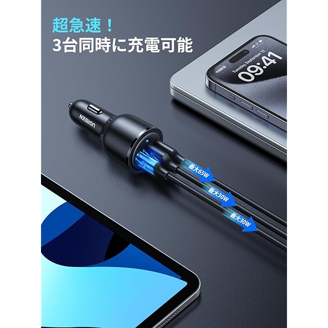 商品名:UGREEN【75W 3ポート】 シガーソケット USB C カーチャージャー PD3.0/QC3.0/PPS対応 急速充電 車載充電器 iPhone16/15/14/13シリーズ/iPad/MackBook/Pixel/Galaxy S25シリーズ等に対応