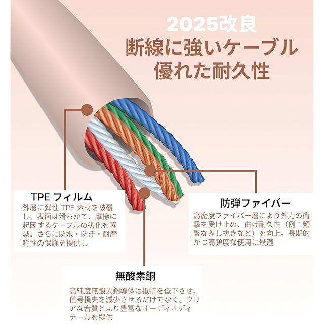【耐久性に優れたケーブル設計の寝ホンイヤホン有線タイプc】 「防弾ファイバー層 × 高純度銅線」を採用することで、ケーブルの耐久性を高めています。 外力に強い素材を使用しているため、曲げたり引っ張ったりしても断線しにくく、繰り返し抜き差ししても長く使えます。 さらに防汗・耐摩耗性を強化しているので、スポーツ時や夏の通勤時など、少し過酷な環境でも安心して使用できます。