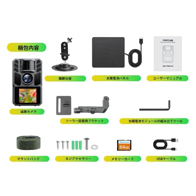 商品名:FKPCAM トレイルカメラ ソーラー式 狩猟用 4K 64MP 防犯カメラ|0.1秒トリガー 高感度センサー ソーラーパネル&5000mAh充電池搭載 IP67防水防塵 山林・野生動物観察に最適 64GBカード付き