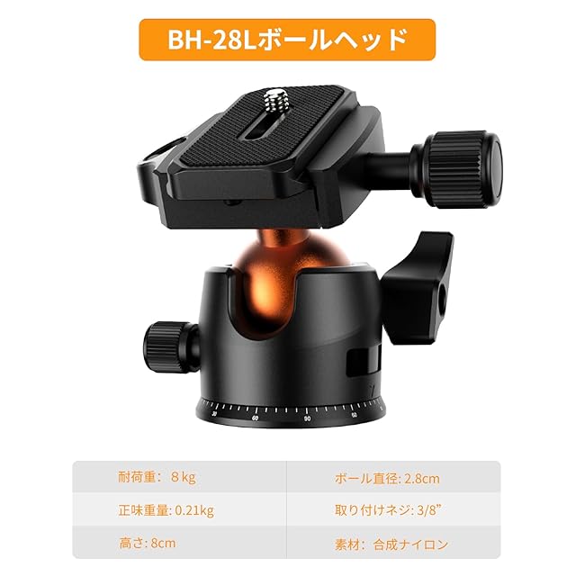 【360度回転・8Kg耐荷重】コンパクト三脚は28mmのボールヘッドを搭載し、8kgの耐荷重を実現し、360度回転可能です。 パノラマ撮影時に一眼レフカメラの動きの範囲を広げることができます。