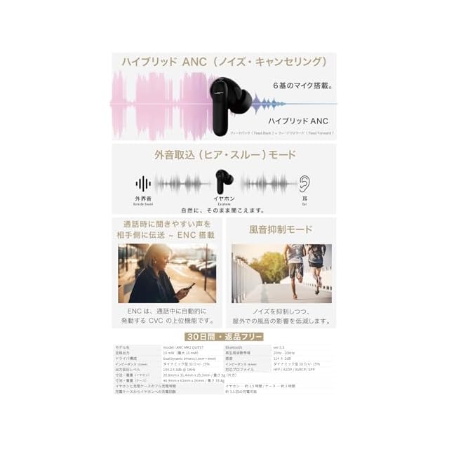 JPRiDE サウンドメイクアプリ:iOS, Androidスマートフォンで使用可能。(メイク機能:バンド数:10、周波数:20~20000hz 可変、フィルタタイプ:3種(Low Shelf, Peak, High Shelf )、BW:Q=0.25~32)<br> <br> <br> ノイズキャンセリング: ANCモード / 外音取り込みモード / 風切音抑制モード / ANC OFF(使用中の順序変更、各モードのON/OFFをアプリで変更可能)<br> <br> <br> 出力音圧レベル:104.2±3db @ 1KHz<br> 定格出力:10 mW<br> 最大入力:15 mW<br> インピーダンス:11mm ダイナミック型 32 Ω +/- 15%/6mm ダイナミック型 10 Ω +/- 15%<br> 感度:114±2dB<br> 再生周波数帯域:20 hz - 20Khz<br> 防水等級:IPX4<br> 対応プロファイル:HFP/A2DP/AVRCP/SPP<br> 寸法:W:20.8×L:31.4×H:25.5 (mm)<br> 重量:5g(片側)<br> 再生時間:8hrs @50% vol OFF ANC(初期設定の音色使用時)<br> 通話時間:4hrs @50% vol OFF ANC、充電時間:1.5 hrs タッチセンサーによる操作<br> Driver:Dual Dynamic Drivers (11mm + 6mm)<br> ケース寸法:W:46.9×L:63×H:26 (mm)<br> ケース重量:33.4g<br> ケース充電時間:2 hrs<br> イヤホンへの充電回数:3.5 times