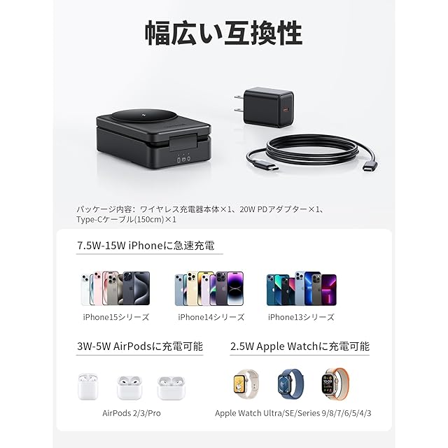 【対応機種】 iPhone 17/17 Air/17 Pro /17 Pro Max,iPhone 16/16 Pro/16 Pro Max/16 Plus,iPhone 15/15 Pro/15 Pro Max/15 Plus,iPhone 14/14 Pro/14 Pro Max/14 Plus,iPhone 13/13 Mini/13 Pro/13 Pro max,iPhone 12/12 Mini/12 Pro/12 Pro Max,アップルウォッチ Ultra/Ultra 2/Ultra 3/SE 第三代/Series 11 10 9 8 7 6 5 4 3 2,AirPods 4/2/3/Pro/Pro 2/Pro 3など。注意:本製品はMagSafe非対応のケースには対応していません。ケースをお使いの場合は必ずMagSafe対応のケースをお使いください。約2.5mm 以上の厚みがあるケース、スタンド付きケース、スマホリング、ポップソケット、磁気カードケースは充電前に取り外してください。充電前に、給電板から透明保護フィルムを剝がしてください。