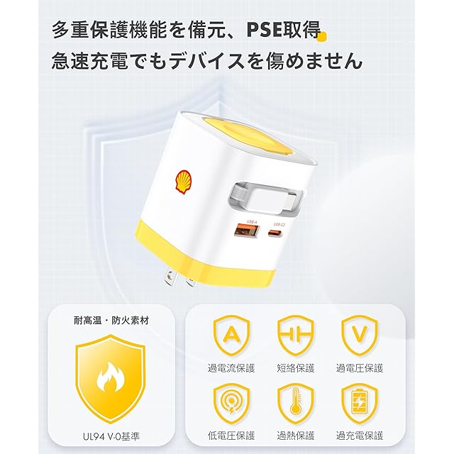 【PSE認証取得 & 多重保護機能】Shellの急速充電器は、日本の電気用品安全法(PSE)の定める技術基準に適合しております。過電流/過電圧/短絡/過熱/過負荷/過充電/低電圧の7段階保護+防火PC素材を採用。接続機器を自動検知し、最適な出力を供給するスマート制御機能搭載します。家族全員で使える、信頼性の高い充電環境を提供します。