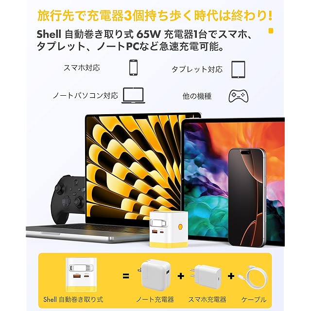 商品名:Shell 巻き取り式 充電器 for アップルウォッチ 65W 伸縮式Type-Cケーブル内蔵 4台同時充電 GaNIII技術 超低温 折りたたみ式プラグ PSE技術基準適合 PD3.0/QC4.0/PPS等規格対応 AppleWatch SE/9/8/7/6/Ultra/Macbook/iPad/iPhone/Androidスマホ/ノートPC各種対応