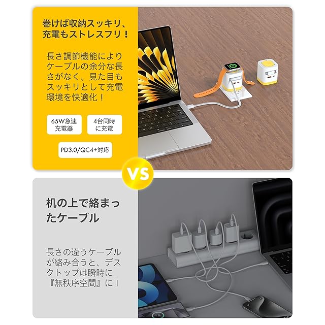 Shell 巻き取り式 充電器 for アップルウォッチ 65W 伸縮式Type-Cケーブル内蔵 4台同時充電 GaNIII技術 超低温 折りたたみ式プラグ PSE技術基準適合 PD3.0/QC4.0/PPS等規格対応 AppleWatch SE/9/8/7/6/Ultra/Macbook/iPad/iPhone/Androidスマホ/ノートPC各種対応