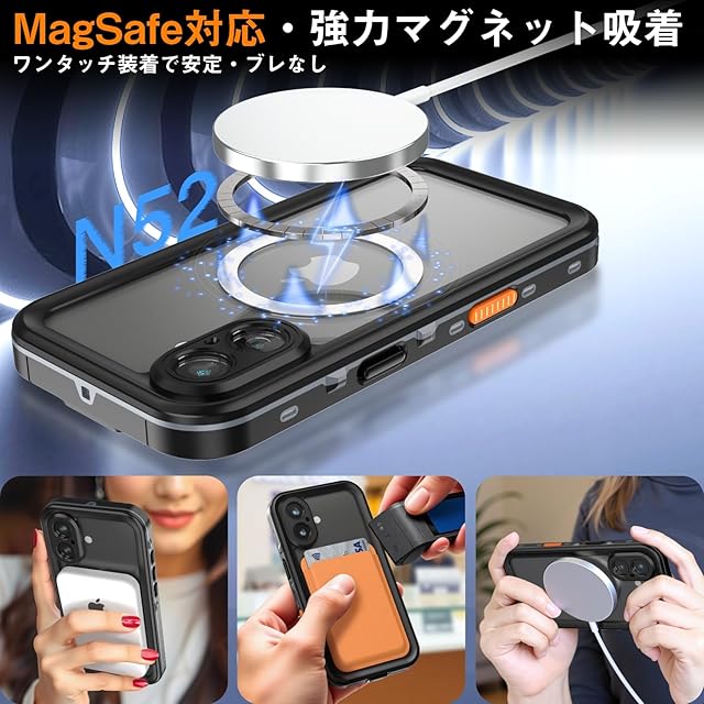 Tmacjump iPhone 17 用 完全防水ケースは、IP68規格の防水防塵性能と米軍落下試験基準MIL-STD-810Gをクリア。 水深2m・1時間の防水性能で、海・プール・温泉・お風呂など、あらゆる環境下でも安心してお使いいただけます。 完全密閉設計がほこりや雪の侵入をブロックし、MagSafe/Qi充電対応でケース装着したままワイヤレス充電が可能。 さらに: 滑り止め溝加工&落下防止ストラップ付きで、登山や釣りなどのアウトドアシーンでも確実に保持 高透明クリア素材により本体デザインを損なわず、カメラレンズを360°全面保護 軽量設計で日常使いにも違和感なし アウトドアから日常まで、防水性と堅牢性を両立した最強ガーディアン。