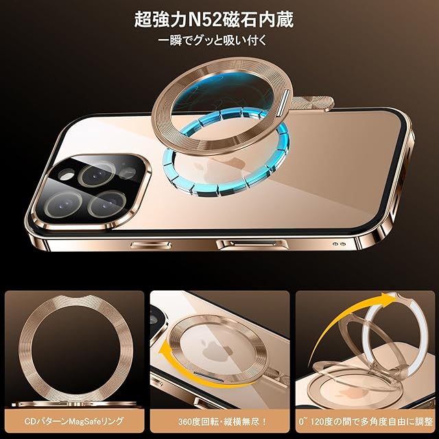 <b>互換性モデル:</b> <br>iPhone 16 Pro 適用 <br><b>CDリング・Magsafe対応</b> <br>このリングは、CDの表面に見られるような円形の溝やパターンを模しており、視覚的にユニークでスタイリッシュな印象を与えます。また、背面に強力なN52マグネットが内蔵されており、ケースを付けたまま、ワイヤレス充電や車載ホルダー、スマホスタンドなどのMagSafeアクセサリーがしっかりと吸着!ワンタッチ、手間なしで充電ができます。 <br><br><b>360°回転スタンド</b> <br>ケースと一体型のスタンドは、360度回転可能で、縦置きでも横置きでも安定して支えられます。動画鑑賞やビデオ通話の際に、手が自由になり、より快適な使用体験を提供します。使用しない時はケースにスマートに収まります。 <br><b>アルミバンパー・一秒に取り付け</b> <br>フレームは超軽量のアルミ製で、iPhone本体と同じ光沢を持ち、高級感を演出します。サイドボタンやレンズ周りのデザインも統一感を持たせ、使い心地と見た目の美しさを両立しました。前後カバーは嵌め込みデザイン、前後カバーを合わせてから、上部にあるロック機能は自動的にロック、スマホとケースの間に隙間がほとんどありません。これにより、スマートフォンがケースの中で動くことがなく、摩耗を防ぎます。また、上部のアクションボタンを押すだけで、ロックの解除できます。 <br><b>カメラレンズ保護</b> <br>一体型ガラスレンズ保護フィルムがカメラを傷から守り、高い透明度で撮影の画質に影響を与えません。 <br><b>360°全面保護</b> <br>高品質な強化ガラスを正面に採用し、背面は衝撃に強い高透明硬質PVC素材を使用しています。これにより、傷や衝撃からスマホをしっかり守りながら、iPhone本来の美しさを引き立てます。 <br><br><b>梱包:</b><br>1* iPhone 16 Pro 適用 ケース <br><br><b>ご注意:</b> <br>カラーや機種の選択は間違いがないよう、ご注文前に再確認をお願いします。 <br>スマホに合わせたサイズで、正面に強化ガラスも採用し、ご使用になる前に他の液晶保護フィルムをはがしてください。 <br>アルミフレームのため、使用中に信号が弱くなる場合があります。ある場所で信号が弱い場合は、慎重に購入してください。 <br><br>Uovonはお客様からの製品に関するご質問に迅速かつ効率的に対応いたします。お客様が快適にお買い物をお楽しみいただけるよう、理由に関わらず返金および交換のサービスを提供しておりますので、いつでも注文履歴から「出品者に問い合わせる」ボタンでご連絡ください。よろしくお願いします。
