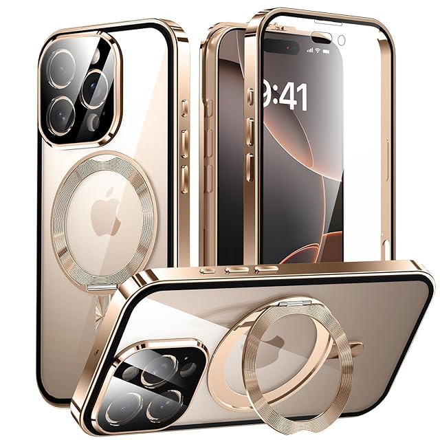 iPhone 16 Pro 用 両面 MagSafe対応 ケース アイフォン16プロ アルミバンパー 360°回転スタンド Uovon スマホケース アイホン16プロ 全面保護 カバー カメラレンズ保護 ワイヤレス充電対応 ロック機能 ・ デザートチタニウム